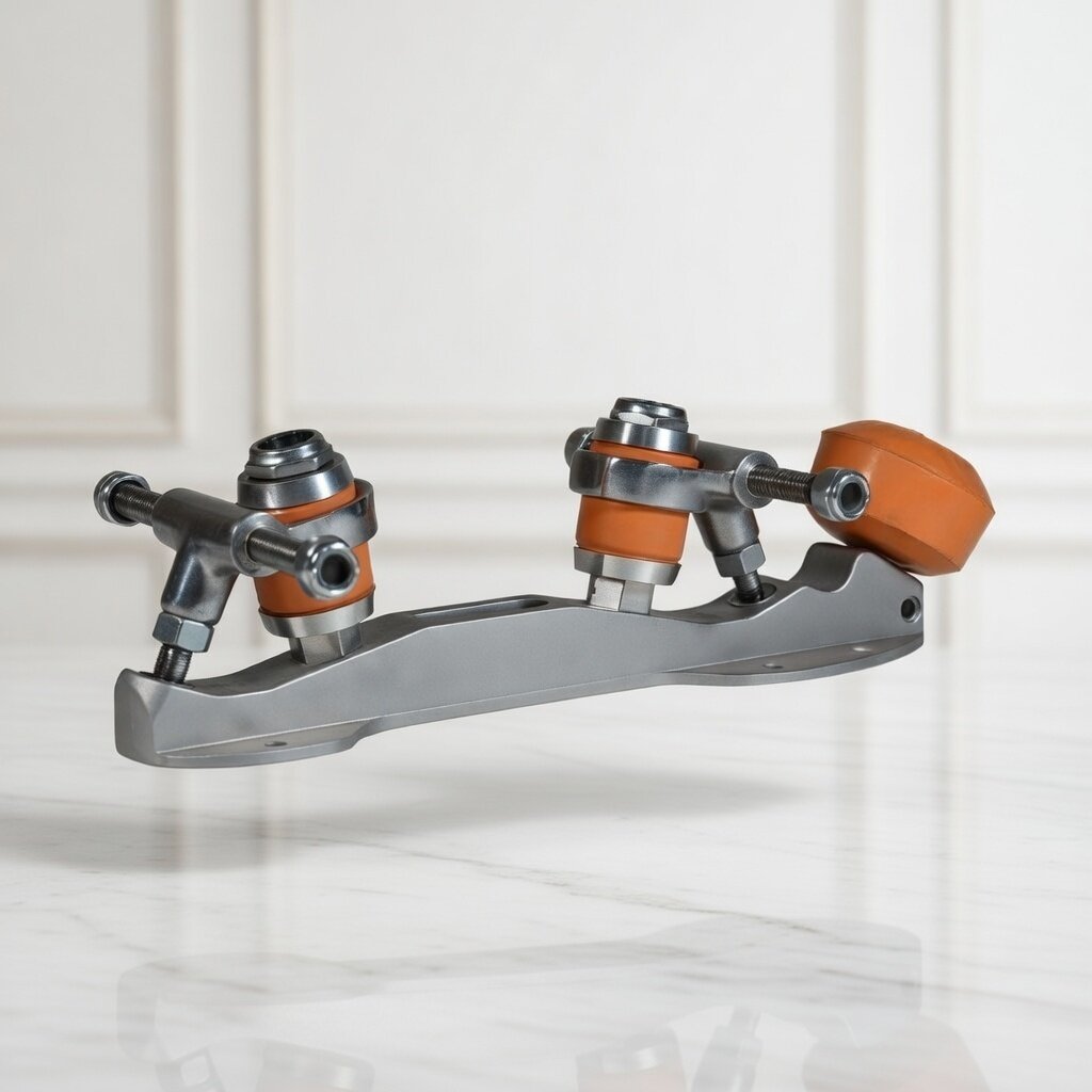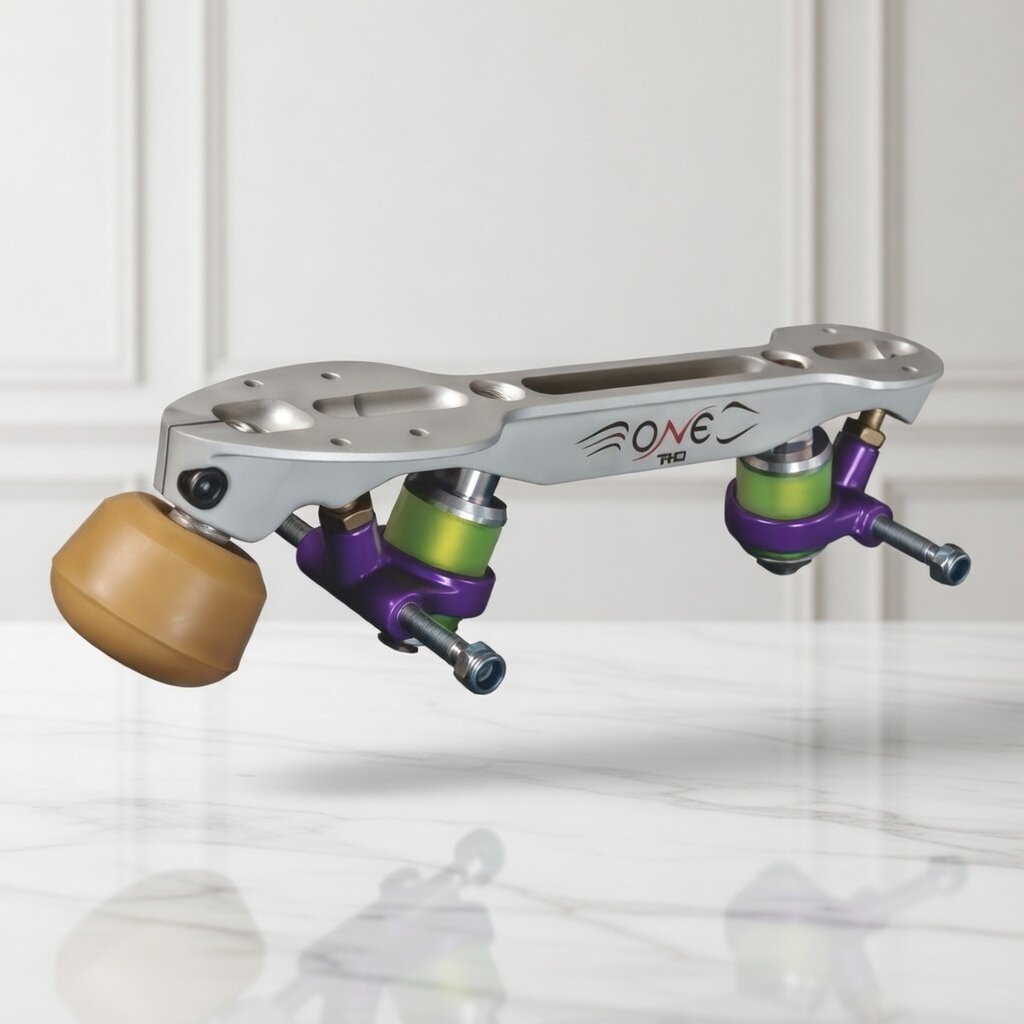 Patin para competicion. El patín SPIN, diseñado para la modalidad de obligatorio, presenta un ángulo innovador para el tren ruedas, además de un nuevo mecanizado, que proporciona una menor torsión y una respuesta inmediata a las presiones recibidas durante los ejercicios.
